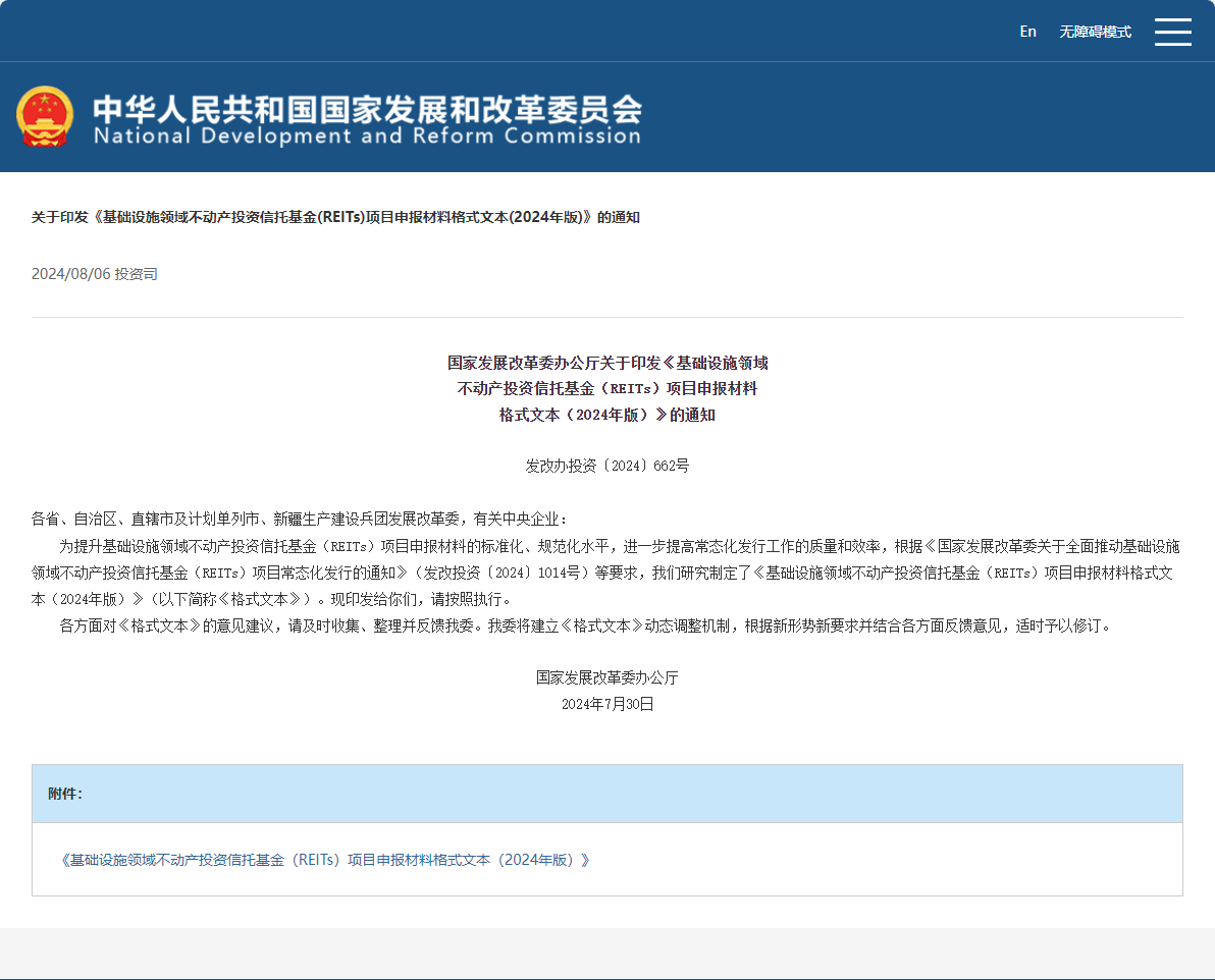國家發(fā)展改革委辦公廳關(guān)于印發(fā)《基礎(chǔ)設(shè)施領(lǐng)域不動產(chǎn)投資信托基金(REITs)項目申報材料格式文本(2024年版)》的通知 發(fā)改辦投資〔2024〕662號各省、自治區(qū)、直轄市及計劃單列市、新疆生產(chǎn)建設(shè)兵團發(fā)展改革委,有關(guān)中央企業(yè):  為提升基礎(chǔ)設(shè)施領(lǐng)域不動產(chǎn)投資信托基金(REITs)項目申報材料的標準化、規(guī)范化水平,進一步提高常態(tài)化發(fā)行工作的質(zhì)量和效率,根據(jù)《國家發(fā)展改革...